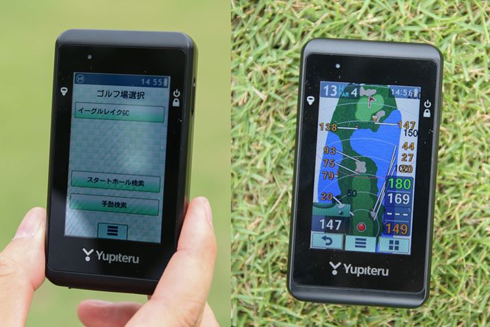 このモデルは、電源を入れるだけで現在地を測位するので、ゴルフ場に着いてから電源を入れるだけで今いるゴルフ場を自動で検索してくれます。後はGPSが現在地を追尾してくれるので、次のホールに行けば表示が自動で切り替わりますし、ボールの地点に行くだけで残りの距離を表示してくれます。
