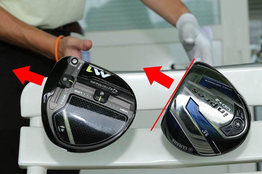 ヘッドを垂らした状態で置いたときに、ほかのクラブに比べフェース面が上を向くクラブは、重心角が大きく設計されている証拠です。上記写真の左のドライバーに比べてUD+2はこの重心角が大きいことがわかると思います(赤矢印はフェース面の向きを表す)。ヘッドが返りやすいのでスライスを軽減させる効果が期待できるんです。