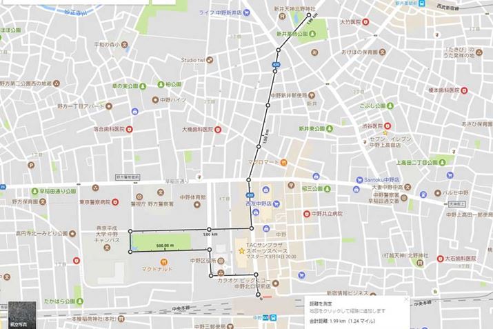 走行予定ルートは、東京・JR中野駅からスタートし、繁華街は避け、公園を1周し、中野通りを北上し新井薬師公園まで行くコース。距離はGoogleマップ上では1.99kmだった。しっかりトラッキングできていれば、このマップと同じような走行軌跡が記録できるはずだ