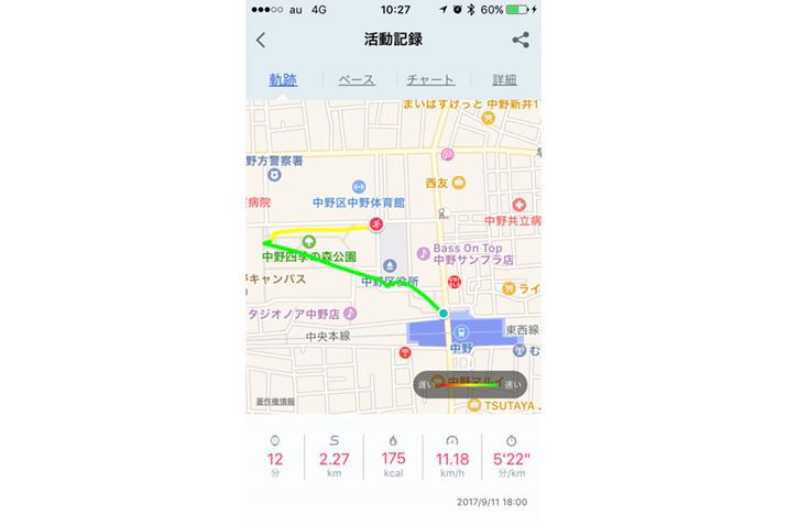 やはり、途中でトラッキングが終了している。さらに駅前から「中野四季の森公園」までの追跡も少々雑な印象。残念……。しかし、それ以外の「活動記録」は取れているようだ。2.27kmを12分で走破したことがわかる。距離の測定においてはGoogleマップと280mの差が出た