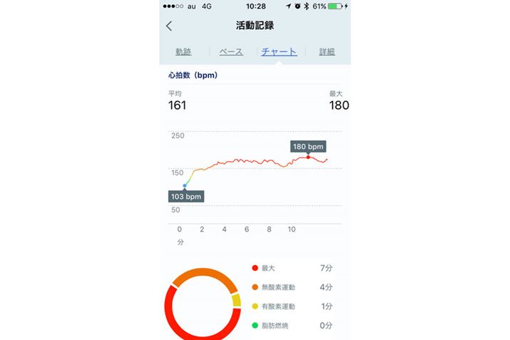 「チャート」では、心拍数の変動を折れ線グラフで、心拍数の割合を円グラフでチェックできる。今回のワークアウトの場合、有酸素運動と脂肪燃焼がほとんどできていない。ダイエットが目的の場合は、ペースをもう少し落として走ればいいことがわかる