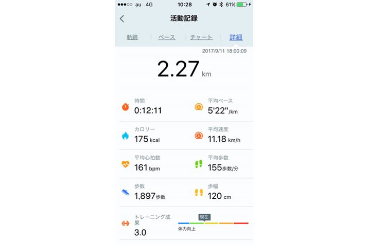 そして「詳細」では、活動記録のまとめが一覧できる。写真は下部が切れているのだが、次の運動までの休息時間の目安も表示されている