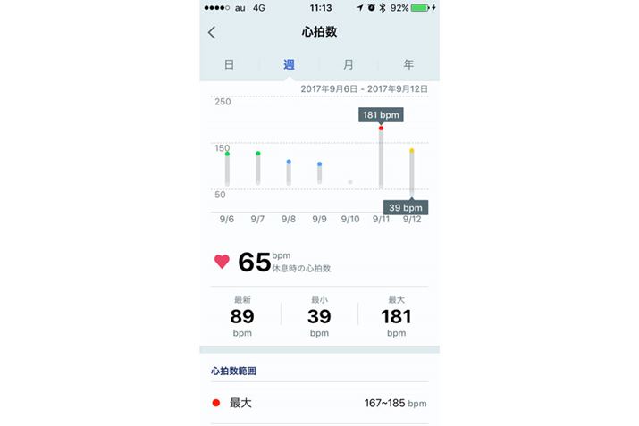 1週間の心拍数をグラフで表示。表示期間内の最大と最小の心拍数もひと目でわかる。ちなみに9月10日は装着し忘れたので記録なし。週以外に、1日/1か月/1年に区切ってデータの変動を確認することもできる