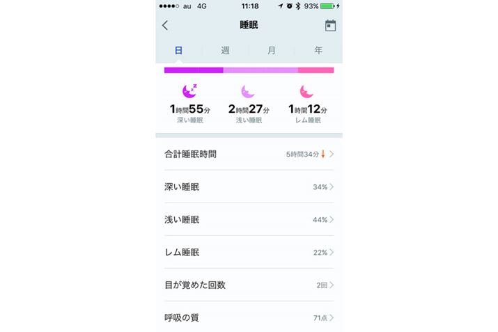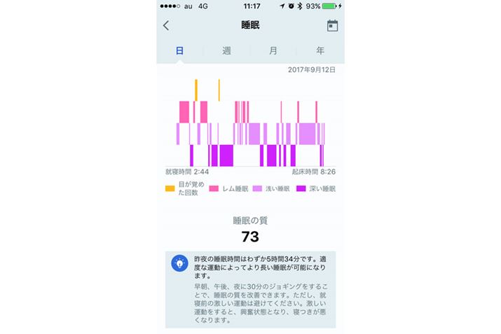 本機を装着したまま寝れば、自動的に睡眠の状態を計測してくれる。この日の睡眠データに対しては、「ジョギングして睡眠の質を上げましょう」というアドバイスが提供されている