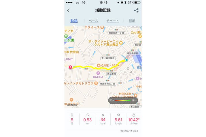ちなみに、東京・JR恵比寿駅から会社までの約0.5kmのウォーキングをトラッキングしてみたら、多少軌跡にブレはあるものの、最初から最後までGPSは途切れずに計測できた