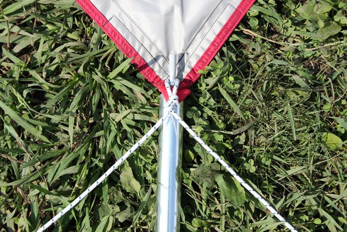 ポールを組み立て、ロープの長さをポールと同じくらいに調整しておきます。次に、広げた生地に、ロープとポールをセット。ポールを中心に60〜90°の角度になるように、ロープを引き出しましょう