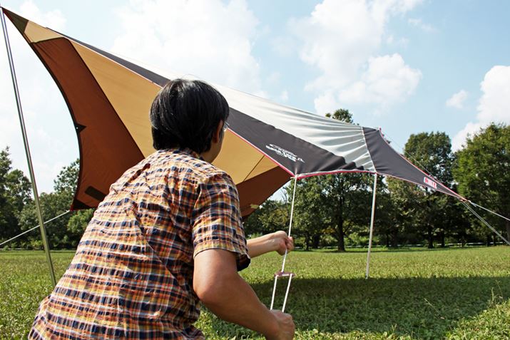今回は、オープンタープの中でも人気のあるヘキサタープ(コールマン「ウェザーマスターヘキサタープ/L」)を設営しましたが、生地を広げてポールを組み立て、ロープをきれいに張るまでにかかった時間は約15分。ロープを引き出す角度や張り具合などを把握してしまえば、上の動画のようにひとりでもバッチリ! ただし、風が強い時はタープがあおられて危ないので複数人で建てましょう。