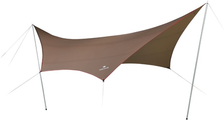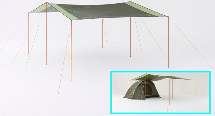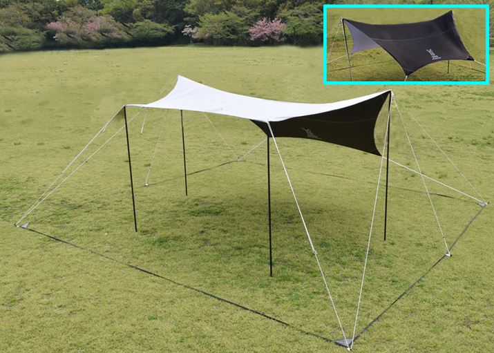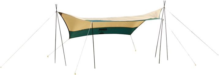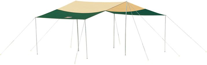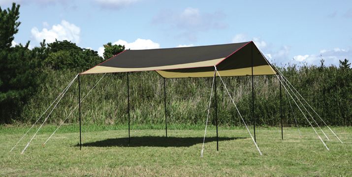 ポール6本で大きな屋根を作る長方形のタープ。ポールをセットする位置や長さを変えることで、建て方のバリエーションが広がります。リビングを広く作れることから、グループキャンパーに人気。