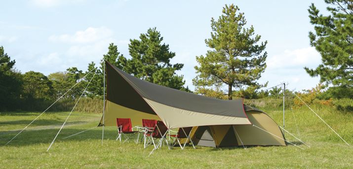 タープのいっぽうのポールを遠く離れたところに立て、タープの中にテントを設営する「小川張り」ができるのが特徴です。テントと一体化したリビングを作ることができるので、雨の日でも濡れることなくテントへの出入りが可能。
