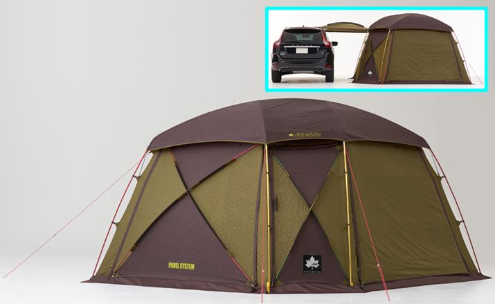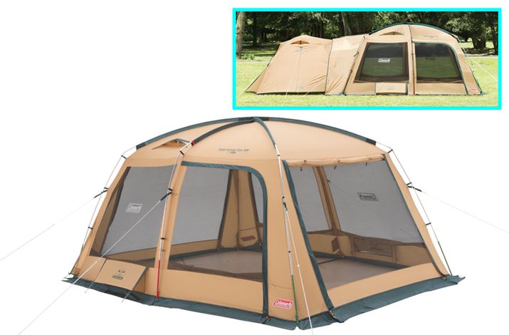 ひとりでも設営できるアシスト機能付き。テントと連結できる「ジョイントフラップ」を装備しています。使用時のサイズは約400(幅)×360(奥行)×210(高さ)cm、収納サイズは約26(直径)×74(幅)cm、重量は約12.5kg