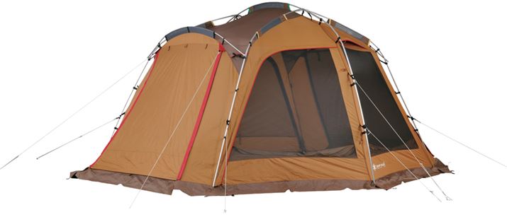 生地を屋根のように張り、日差しや急な雨などをガードするオープンタープは開放感がバツグン! その半面、雨が吹き込みやすく、風が強いとあおられやすいという懸念点もありますが、構成パーツが少ないのでコンパクトに収納でき、価格が比較的リーズナブルという魅力もあります。なお、オープンタープの中にも種類がいくつかあり、現在の主流は「ヘキサタープ」と「レクタタープ」の2種類。六角形をした「ヘキサタープ」は通常2本のポールで立ち上げるため、設営が比較的簡単で収納もかさばりにくく、長方形の「レクタタープ」は6本のポールを使用するので、収納サイズは大きくなるものの広い居住スペースが望めます。