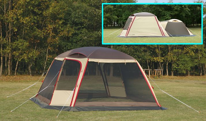 メッシュパネルとフラップを装備したパネル4面のほかに、2か所の出入り口が用意されているのが便利。ドームテントとの接続をしっかりと行えるカーテンも付いています。