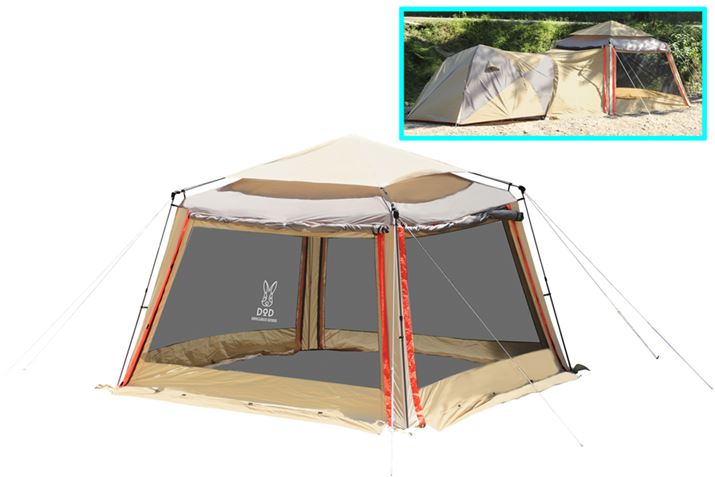 テントのような見た目で、組み立てもテントと同様。オープンタープにはない壁面があるので、雨や風などの天候に左右されることが少なく、虫の侵入を防ぎやすいことも魅力です。ただ、四方が覆われているため、開放感はあまり得られませんが、メッシュにすれば通気性は問題なし! 設営も比較的しやすいので、ビギナーに人気があります。オープンタープに比べ、収納サイズは大きく、価格も若干高め。
