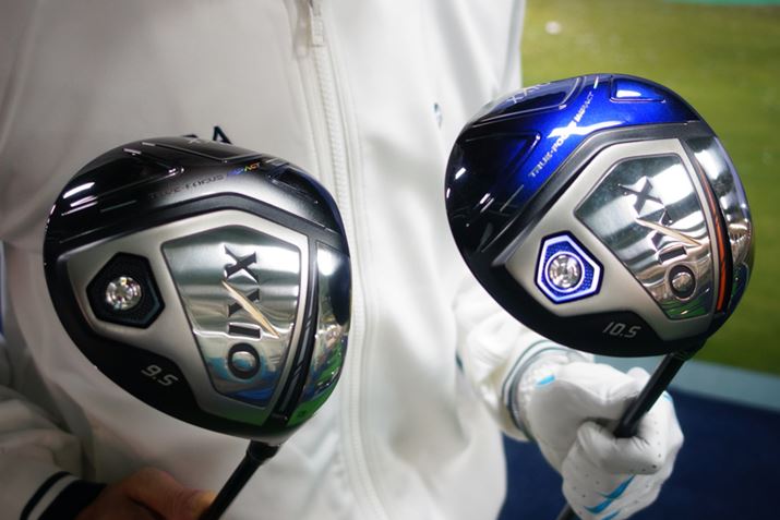 今回試打したゼクシオ テン ドライバーの2つのモデル。レギュラーシャフトの青いヘッド(右)とミヤザキシャフト装着の黒いヘッド(左)