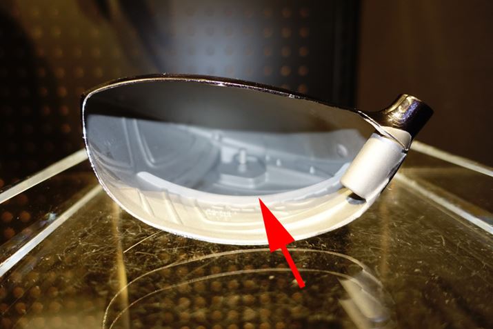 ヘッド内部に「サウンドリブ」と呼ばれる突起(矢印部分)を作り、インパクトでいい音を奏でるように作られているゼクシオ テン ドライバー