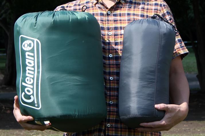 封筒型よりマミー型、化繊よりダウンのほうがコンパクトに収納できる傾向。筆者所有の化繊の封筒型(左)とダウンのマミー型(右)を比べてみると、こんなに大きさが違います