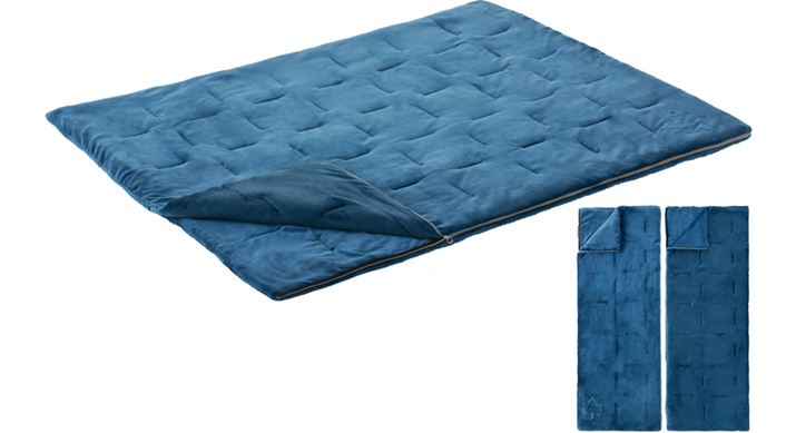 中綿にはポリエステルを使用しており、快適温度は5℃以上となっています。使用時のサイズ(連結時/分割時)は約168(幅)×190(長さ)cm/約84(幅)×190(長さ)cm、収納サイズは約35(直径)×42(高さ)cmで、重量は約3.7kg