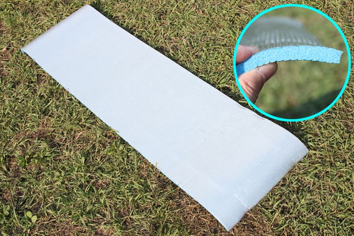 マット表面を波状にすることで、地面の凸凹を感じさせないように配慮。さらに、使用時のサイズが約60(幅)×180(長さ)cmと大人ひとりをカバーする大きさでありながら、約230gという軽量を実現しました。肩にかけられる収納バックも付属するので、持ち運びも容易です。