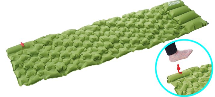 内蔵されているポンプを足で踏めば空気が入れられるので、準備が楽々! 頭の部分には厚さ約10cmのピロー部が設けられており、枕を別途用意しなくても快適に眠ることができます。