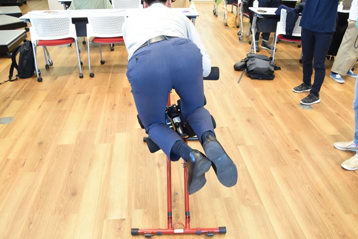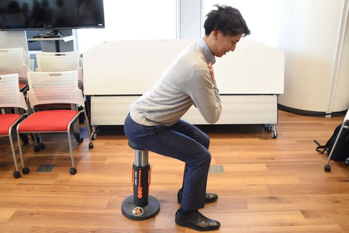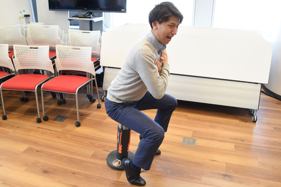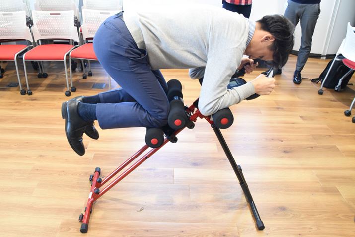 早速、「スクワット マジック」の基本トレーニングの動きをチェックした。使い方は簡単で、本体上部のシートの上に座るだけ。