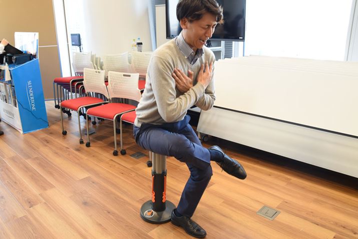 片足スクワットをしたりと、通常のスクワットでは難しい、より負荷のかかる姿勢で効率的に鍛えられる。写真の試用者の顔の表情からわかるように、普段運動をしている人でもかなりキツい!