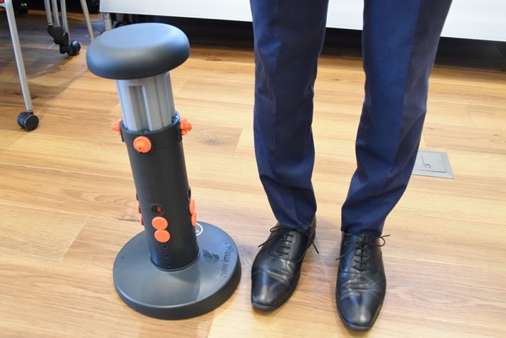 写真は収納時の状態。高さを約557mmまで縮められる。使用時には、ゴムバンドを指定の位置に取り付けるだけで、組み立てなどは必要なくすぐにエクササイズが始められる
