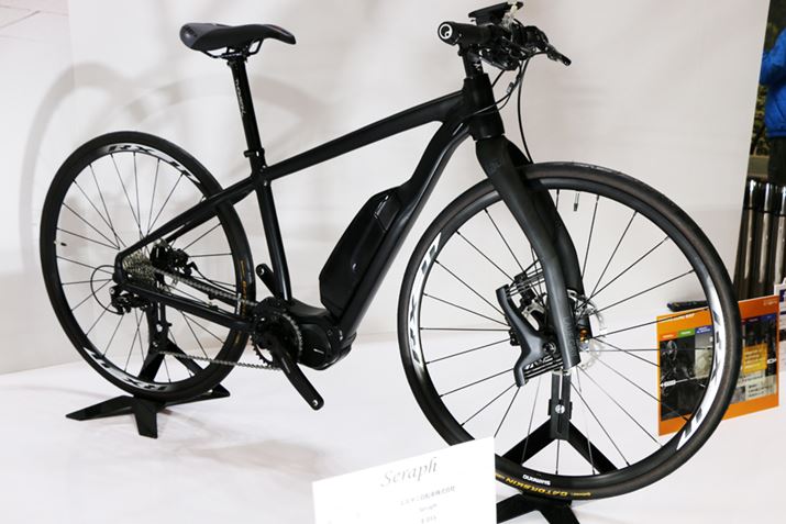 カーボン製の板バネのような構造で衝撃を吸収するユニークなフロントフォークを搭載したモデルは、「Seraph(セラフ)」の「E-01S」。2018年春頃の発売を見込んでおり、価格は38万円(税別)の予定となっている