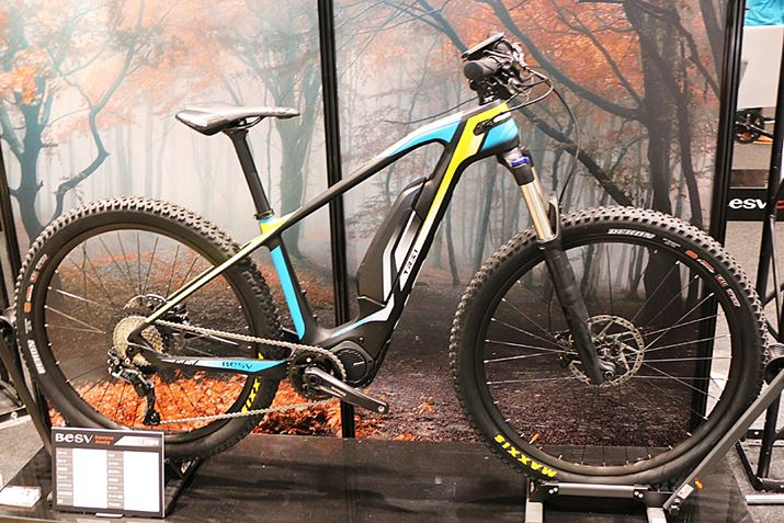 プレミアム感の高いe-Bikeを展開する「BESV(ベスビー)」には、既存モデルに加えて3車種の新型モデルが展示されていた。特に注目すべきは、シマノ製ユニット「STEPS」を搭載したマウンテンバイクタイプ「TRS1」。これまでBESVは自社製のインホイールタイプのモーターを搭載していたが、初めて他メーカーのユニットを採用することとなる。このことからも、シマノ「STEPS」は非常に完成度が高いといえるだろう。その他の部分も、「TRS1」のクオリティは上々。カーボン製のフレームを採用し、車重は18kgと、e-Bikeとしては軽量な部類となっている。それでいて140kmのアシスト距離を実現しているというからおどろきだ。Qファクターやチェーンステー長も一般的なマウンテンバイクと同等のスペックとなっており、100mmストロークのサスペンションが装備されている。
