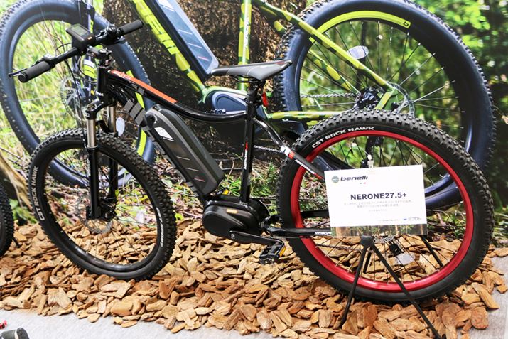 昨年のサイクルモードで「TAGETE27.5」というマウンテンバイクタイプのe-Bikeを出展し、その後、市販も実現したイタリアンブランド「Benelli(ベネリ)」には、さらに走破性を高めた「NERONE27.5+」がラインアップ。搭載されるアシストユニットは同じだが、「TAGETE27.5」よりも0.9インチ太い3インチのブロックタイヤを履かせることで、グリップと凹凸を乗り越える性能を向上させているようだ。「TAGETE27.5」を山の中で試乗した際には、パワフルなアシストとマウンテンバイクならではの遊べる車体構成に感心したものだが、この「NERONE27.5+」の幅が増したタイヤなら、よりアクティブな楽しみ方ができるだろう。