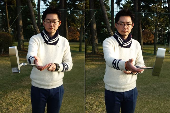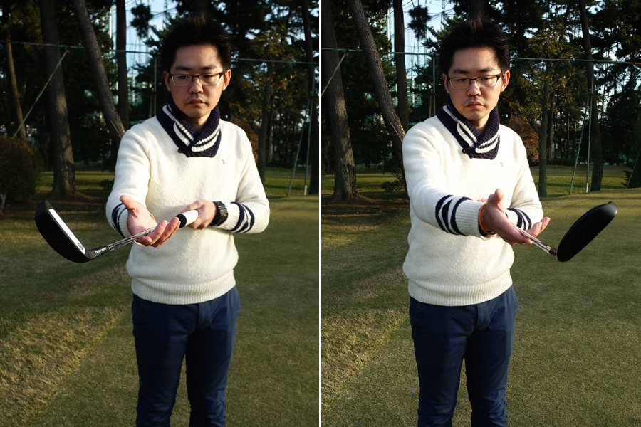 スイングするクラブに近い「L字」パターは、ヘッドを宙に浮かして平らな面に置いたとき、フェースが横を向き、ヘッドのトゥ側が大きく下に垂れるトゥバランスになります。これはアイアンなどスイングするクラブも同じで、同じぐらいの振り幅で振ってみると振り心地がとてもよく似ています。