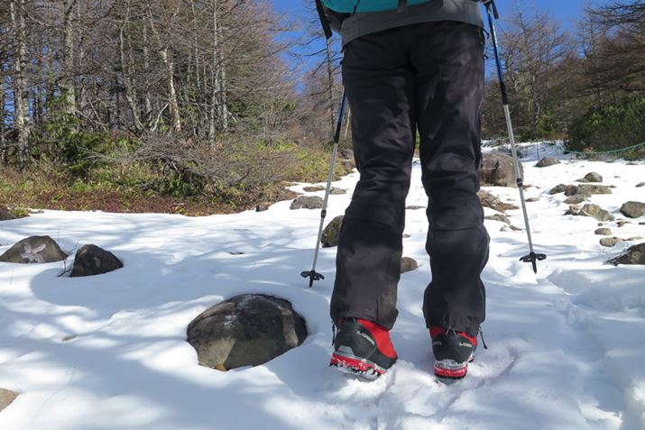今回の上信越の山でのテストは、12月初旬。雪はかなり積もってきていたが、日なたでは雪が溶け、岩が露出しているところも多かった。その半面、溶け出した雪が硬く凍結し、滑りやすいことこのうえない場所も。むしろたっぷりと雪が積もってくれたほうが足元は一定のコンディションになり、行動しやすいのだが……。今回のような中途半端な状況が、一番歩きにくいのであった。