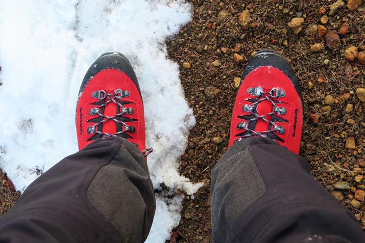 今回の山行では、ブーツのみの状態とブーツとクランポンを組み合わせた状態との2通りで行動した。どちらの場合も大きな問題はなく、いつも快調。このマウンテンエクスパートGT EVOは足型がスリムで少し細身のモデルだが、僕の足(甲の高さと幅の広さは、日本人では一般的なサイズ)でも無理なく履け、不満は見当たらない。そのうえであえて気になる点を探していけば……。
