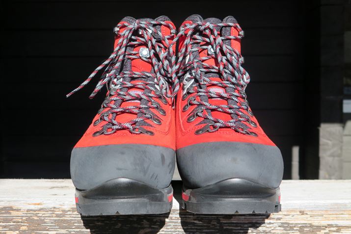 正面から見ると、ソールの上の黒いラバーの面積が目立つ。これはランドなどといわれるパーツで、ほとんど曲がらないほど硬質だ。これによって足の周囲を守り、どの角度からブーツが岩に当たっても、内部の足が痛まないようにしている