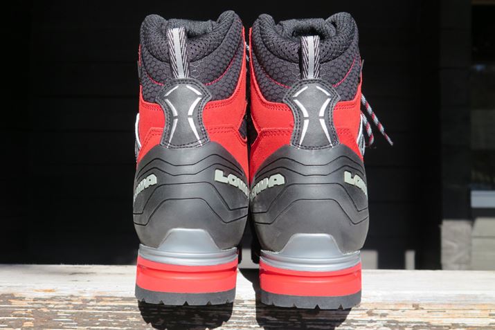 後ろから見ると、かかとの部分はさらに高い位置まで硬い素材で守られている。この、かかとの部分はブーツの要。カップ状になった内部のホールド感とサポート力によって、ブーツの良し悪しは大きく左右される