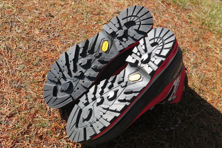 横から眺めると、ソールがどのように地面と接しているのかがよくわかる。マウンテンエクスパートGT EVOのようなアルパイン系ブーツのソールはほとんど湾曲せず、つま先がわずかに上がっている程度。このほうが地面と接する面積が広く、グリップ力が発揮される