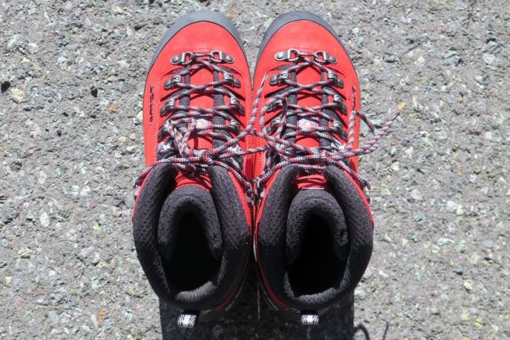 アッパーの上部は少し広がっている。マウンテンエクスパートGT EVOは比較的タイトな造りだが、足入れしやすいのはこのためだ。足首まわりにはクッション性が高い素材が配置され、歩行時にも痛みを感じない