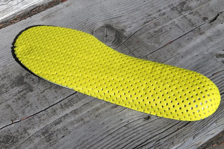 フットベッドの裏側。弾力性が高い樹脂素材には多くの穴が空き、足裏の湿気を逃す役割を果たしている。マウンテンエクスパートGT EVOには透湿防水素材のゴアテックスが使われ、これらの連動で無用な湿気を排出していく
