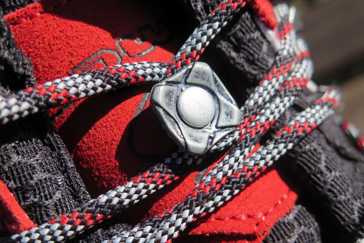 シューレースを締め終わった状態。このシステムの名前とおり、シューレースがX型になっている。中央のパーツには左右からほどよくテンションがかかり、いつも同じ位置にキープされる