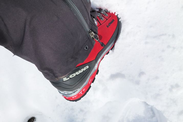 色はレッド。雪山用のブーツはレッドやオレンジといった発色がよいものばかりだが、これは雪の上での視認性を高めるため。雪中に足が埋没したり、地吹雪のような状態になっても、自分の足がどこにあるか判別しやすく、転倒や怪我の防止になる