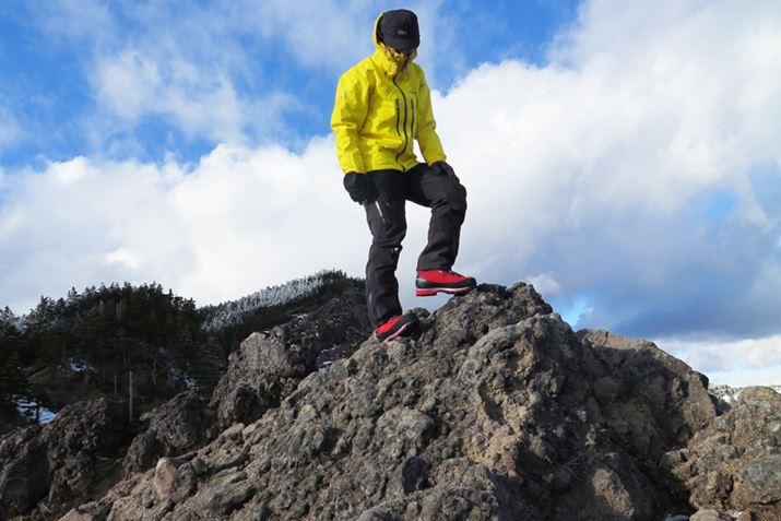 一切の雪が溶け切った山頂近くの岩の上。マウンテンエクスパートGT EVOはこのような岩場にも強く、雪がない時期でも活躍するだろう。しかし硬くて重いため、無雪期の一般登山道では疲れやすい。やはりもっとも適しているのは、ある程度の雪が積もった冬の山だ