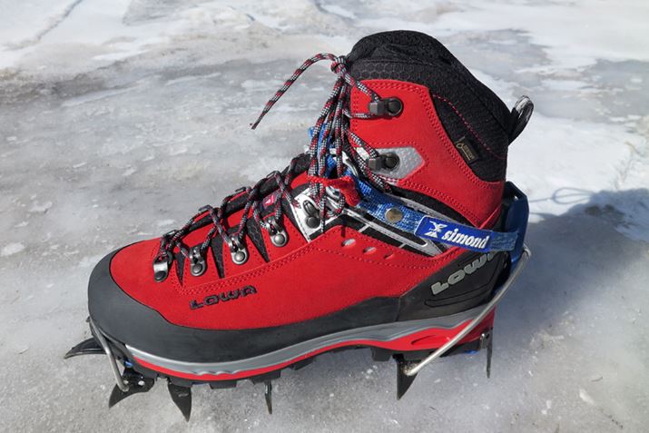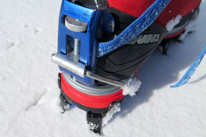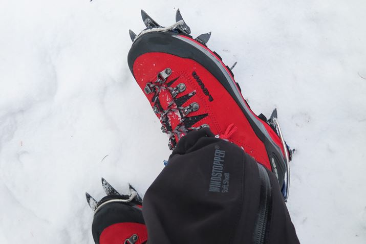 雪山に適したアルパインブーツにはクランポン(アイゼン)をつけて歩くことも多い。とはいえ、雪がない場所ではつけないで歩く時間がほとんどない場合もあり、状況によっては何度も脱着を繰り返す時もある。だからこそ、クランポンとの相性も確認しておかねばならない。