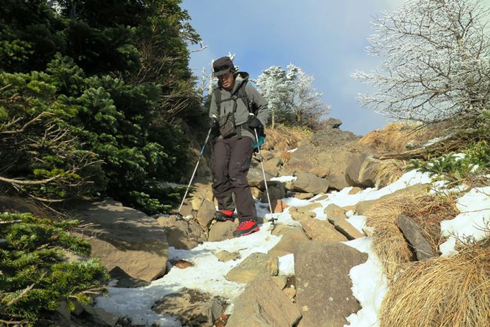 雪が付き始めた岩の上。こんな状況でも硬いソールは岩の突起を確実にとらえてくれ、安心感は高い
