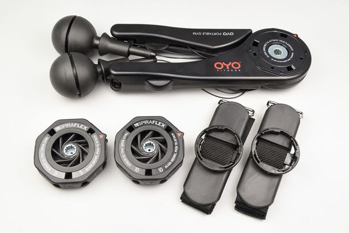 2018年1月15日に発売される「OYO パーソナルジム」。本体(写真上)のほかに、負荷を生み出す「レジスタンスパック」(左下)と、足を使ったトレーニングを可能にする「レッグアタッチメント」(右下)が付属する