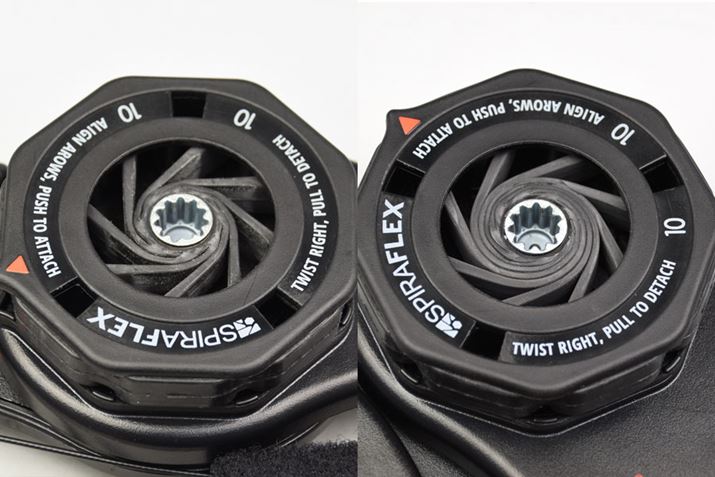 写真左は、アームが開いた状態。本体のアームを両手で閉じると、写真右のように「レジスタンスパック」内部のゴムが巻き取られることで、負荷が発生する