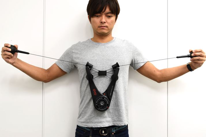 「OYO パーソナルジム」の基本動作は、アームを開閉するエクササイズと、ワイヤーが付いた両端のボールグリップを引っ張るエクササイズの2種類。前者は「押す」、後者は「引く」の動作なので、1台で全身のトレーニングが可能なうえに、胸、背中、腹、足、尻など、部位ごとの集中トレーニングも行える。小型フィットネスマシンで押す/引く両方の運動ができるモデルは珍しい。