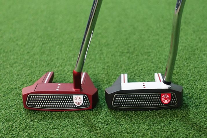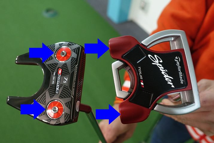 たとえば、マレットタイプとして人気の高いテーラーメイドのスパイダーシリーズ。このシリーズは、一貫してヘッド後方にウェイトを配置しています(上の写真・右)。対してこちらも人気があるオデッセイの#7モデル(同・左)。オデッセイはシリーズによってフェースの素材や形、カラーなどさまざまなタイプがありますが、ベースとなる形状は基本的に同じ。この#7は過去に後方にウェイトを付けたモデルもありましたが、最近はフェース寄りの前方にウェイトを付けるケースが多いですね。