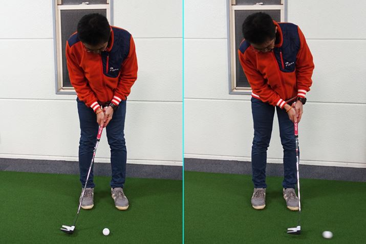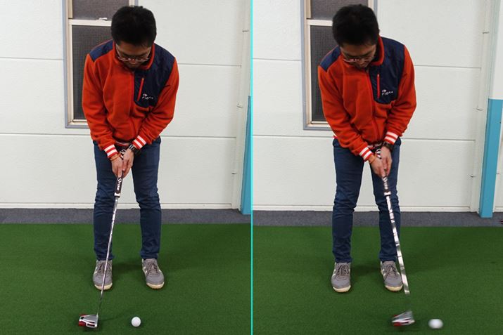 ではウェイトの位置によって何が変わるのか。まず振ってみて違いを感じるのが操作性。ウェイトが前方にあるモデルは、重さがシャフトの近くにあるため、ヘッドの開閉がしやすいです。ウェイトが後方にあるモデルは、重さがシャフトから離れているため、ヘッドの開閉が穏やかで急な操作を受け付けません。ヘッドの奥行きが大きいものほど、このウェイト位置の違いは感じやすいですね。皆さんが考えるマレットタイプのイメージは、後者のウェイトが後方にあるタイプだと思います。オートマチックに振れて多少芯を外しても転がりが変わらないタイプがこれに当たります。ショルダーストロークでパチンとインパクトを作るよりは、ストロークの幅でタッチを出すタイプのゴルファーに合うモデルです。こういったパターを、インパクトの強弱でタッチを出したい方が使うとロングパットで飛びすぎてしまったり、微妙な距離感を出しづらくなってしまったりといった症状が出てしまいがち。そういった方は、前者のモデルを使うと、ウェイトが前方にあるため飛びすぎるといった心配が少なく、操作もある程度は可能です。