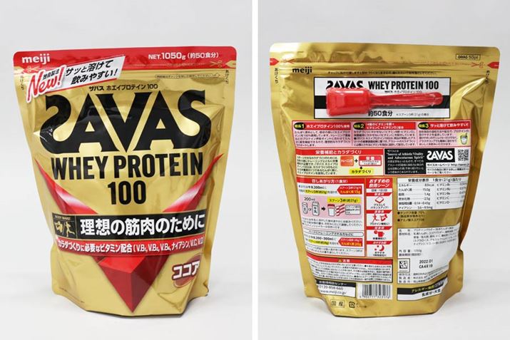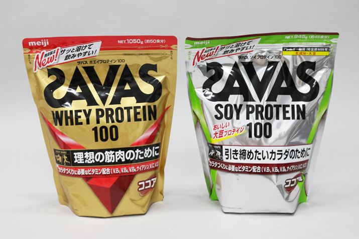 多くのメーカーが、ホエイプロテインとソイプロテインの両方をラインアップしています。写真は、「ザバス ホエイプロテイン100 ココア味」と「ザバス ソイプロテイン100 ココア味」。2020年にリニューアルされ、溶けやすさが大幅に向上しました