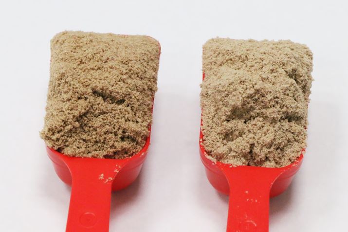 左がホエイプロテインで、右がソイプロテイン。粒子の大きさはほぼ変わらず、牛乳や大豆のニオイもしないので、見た目で違いはわからないかも。ただ、水に溶かして飲んでみると、ホエイプロテインは口に牛乳っぽいニオイが少し残る印象