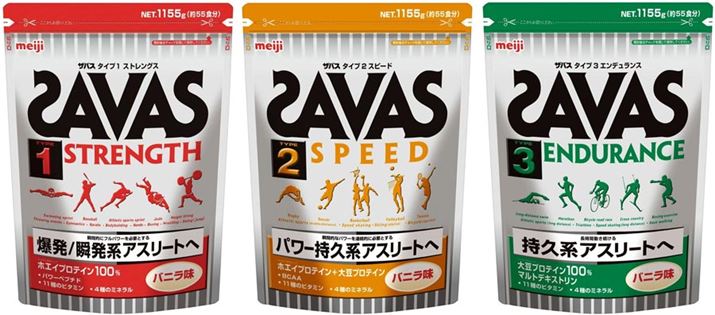 運動の種類にあわせて調整したプロテインも発売されているので、用途が決まっている人はこのような商品を選ぶのもいいでしょう。たとえばザバスには、野球や陸上の短距離種目、格闘技などに適する“爆発/瞬発系”「タイプ1 ストレングス」(左)、球技や陸上の中距離種目、スプリント自転車などに効果的な“パワー持久系”「タイプ2 スピード」(中央)、陸上長距離種目や自転車のロードレース、トライアスロンなどに向く“持久力系”「タイプ3 エンデュランス」(右)がラインアップされています